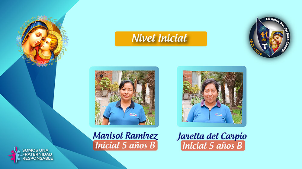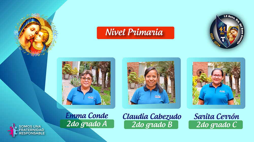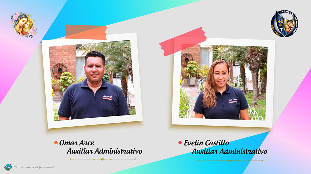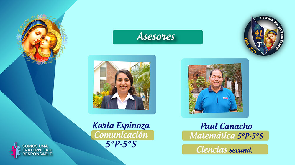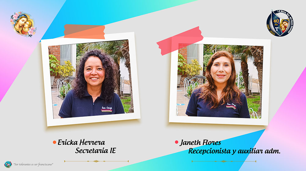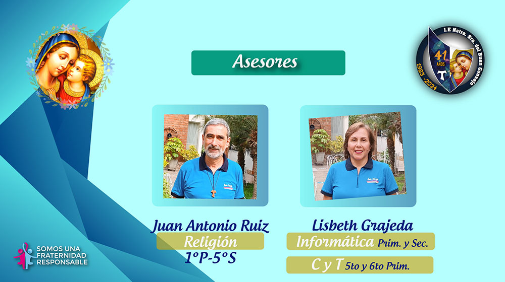 PERSONAL DIRECTIVODirectora GeneralSor Juana Jorge GarcíaSub Directora AdministrativaSor Emilia Santos SantosEquipo Directivo Item de carrusel 01Directora GeneralSor Juana Jorge GarcíaItem de carrusel 02Sor Emilia Santos SantosSub Directora AdministrativaItem de carrusel 04Lic. Rosa María Torres TorresJefe de Norma y ConvivenciaCoordinadora de TutoríaItem de carrusel 03Juan Antonio Ruiz GutiérrezCoordinador de PastoralCoordinaciones Item de carrusel 03Mg. Lourdes Echavigorín VargasCoordinadora de 5to de primaria a 5to de secundariaItem de carrusel 04Mg. Mónica Dávila Paz Coordinadora de Inicial a 4to grado de PrimariaCoordinadora de ActividadesItem de carrusel 02Juan Antonio RuizCoordinador PastoralPersonal Educativo Inicial Primaria Secundaria Administrativo Asesorías